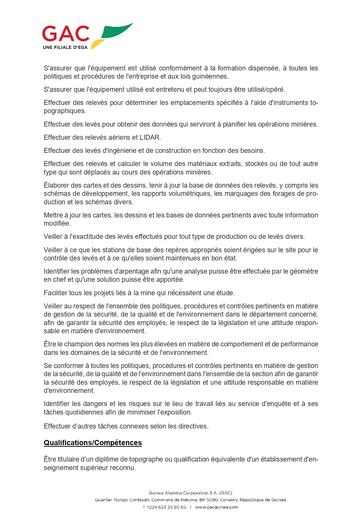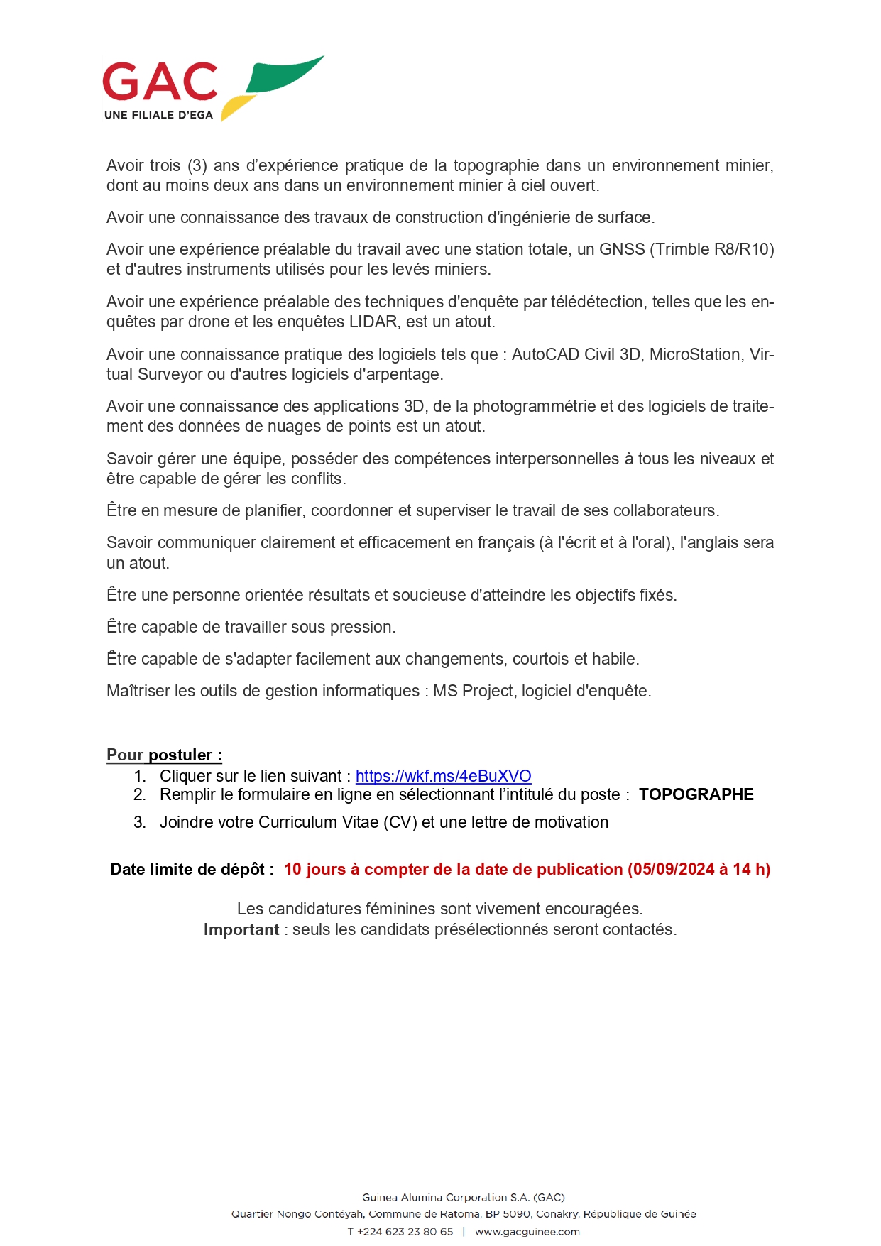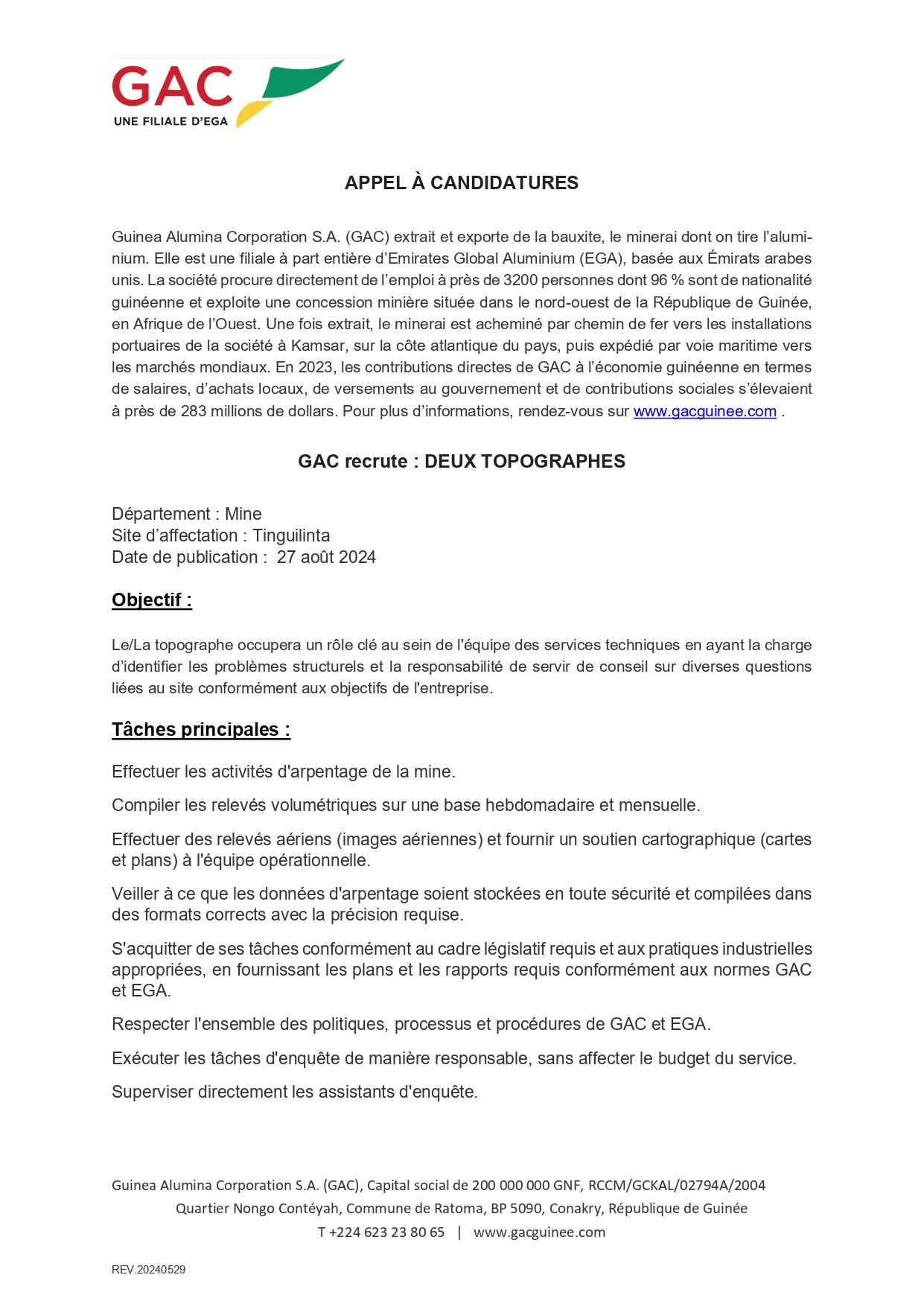 Offre d’emploi : Guinea Alumina Corporation (GAC) recrute deux Topographes Offres d'emploi By alphaleserum@gmail.com Last updated Août 28, 2024 Share Rejoignez la dynamique équipe de Guinea Alumina Corporation (GAC) et vivez de belles expériences professionnelles. Guinea Alumina Corporation (GAC)Guinea Alumina Corporation (GAC)recruterecrutement à Guinea Alumina Corporation (GAC) Share