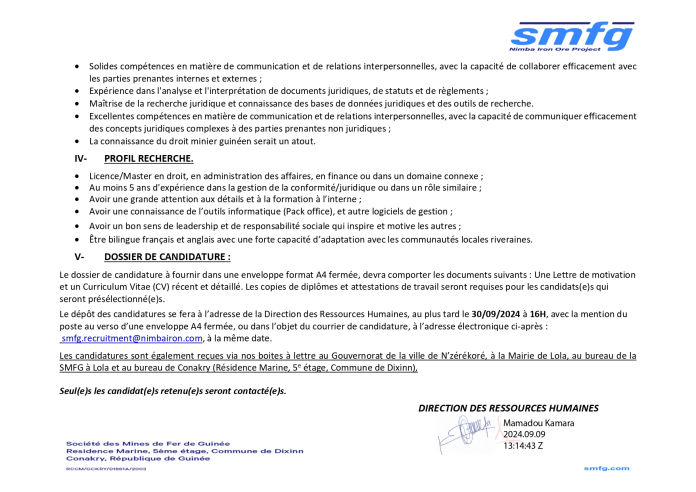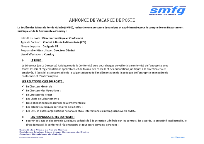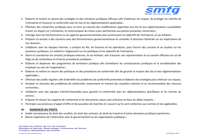 Offre d’emploi : la SMFG recrute un Directeur Juridique et Conformité Offres d'emploi By alphaleserum@gmail.com Last updated Sep 13, 2024 Share Share
