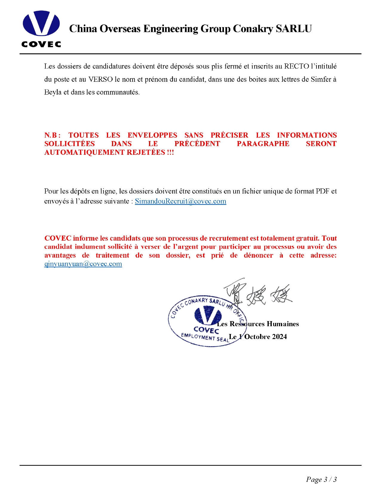 Dans le cadre d’un projet de construction pour le compte de Rio Tinto, la société China Overseas Engineering Group Conakry SARLU recrute massivement pour divers postes à Canga Est. Si vous avez de l’expérience dans le domaine de la construction, que vous êtes prêt à relever de nouveaux défis et à rejoindre une équipe dynamique, nous avons des opportunités pour vous ! Découvrez les nombreux postes disponibles et faites partie d’une entreprise en pleine expansion.