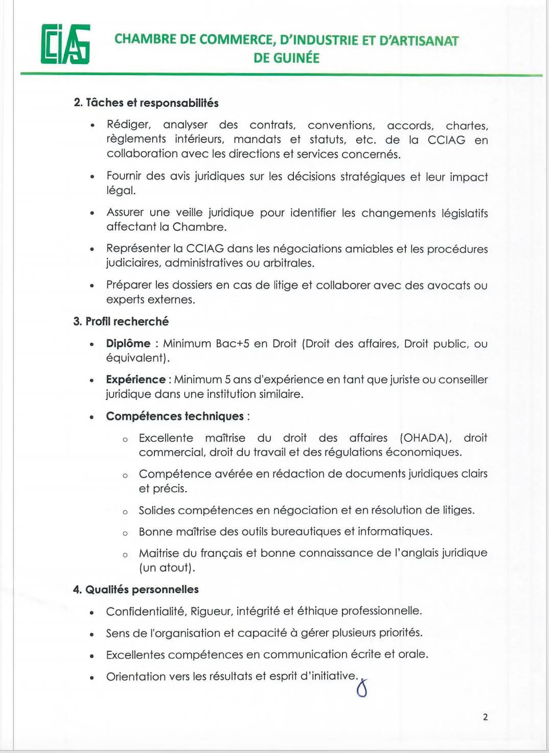 Offre d’emploi : la Chambre de Commerce, d’Industrie et d’Artisanat de Guinée recrute un(e) Conseiller(e) Juridique