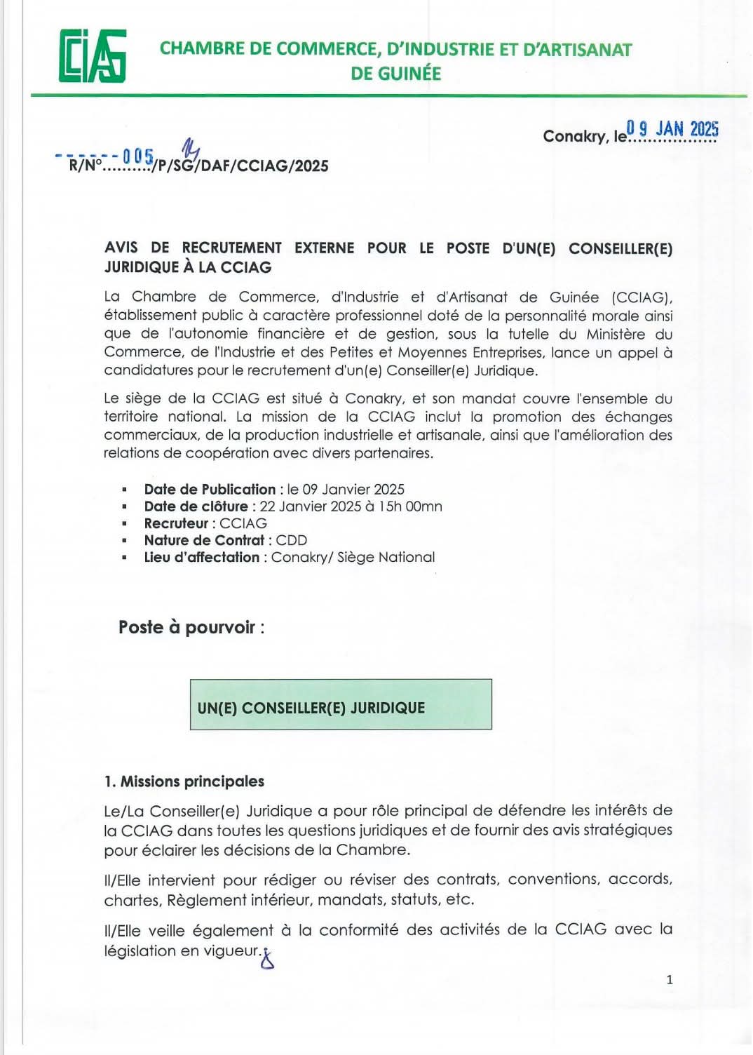 La Chambre de Commerce, d’Industrie et d’Artisanat de Guinée recrute un Conseiller(e) Juridique.