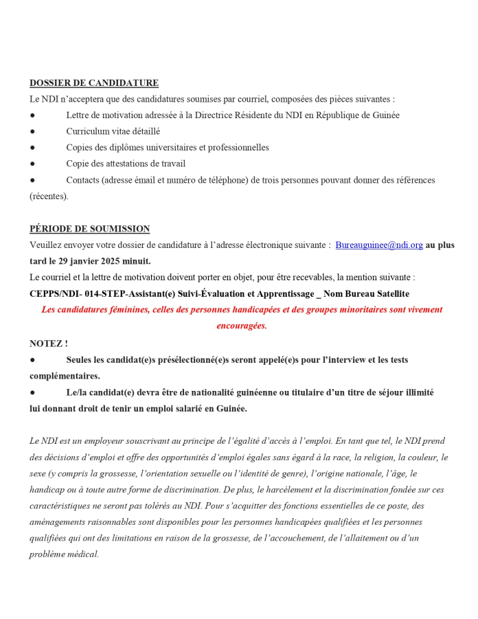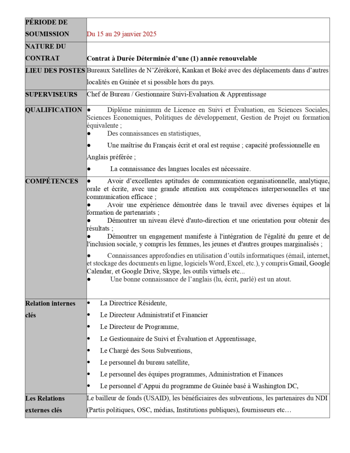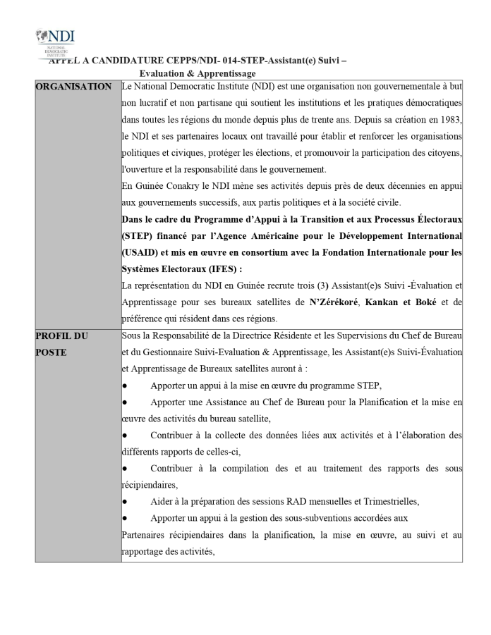 Offre d’emploi : NDI recrute un(e) assistant(e) Suivi-évaluation et Apprentissage Offres d'emploi By alphaleserum@gmail.com On Jan 16, 2025 Share Share