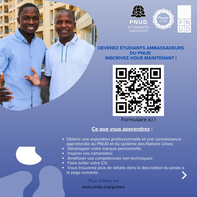 Opportunité : devenez étudiant(e)s ambassadeur(drices) du PNUD Opportunités By alphaleserum@gmail.com On Jan 24, 2025 Share Inscrivez-vous et transmettez votre CV et lettre de motivation via ce lien : https://urls.fr/JKtEYP Date limite de dépôt des candidatures : 20 février 2025 Share