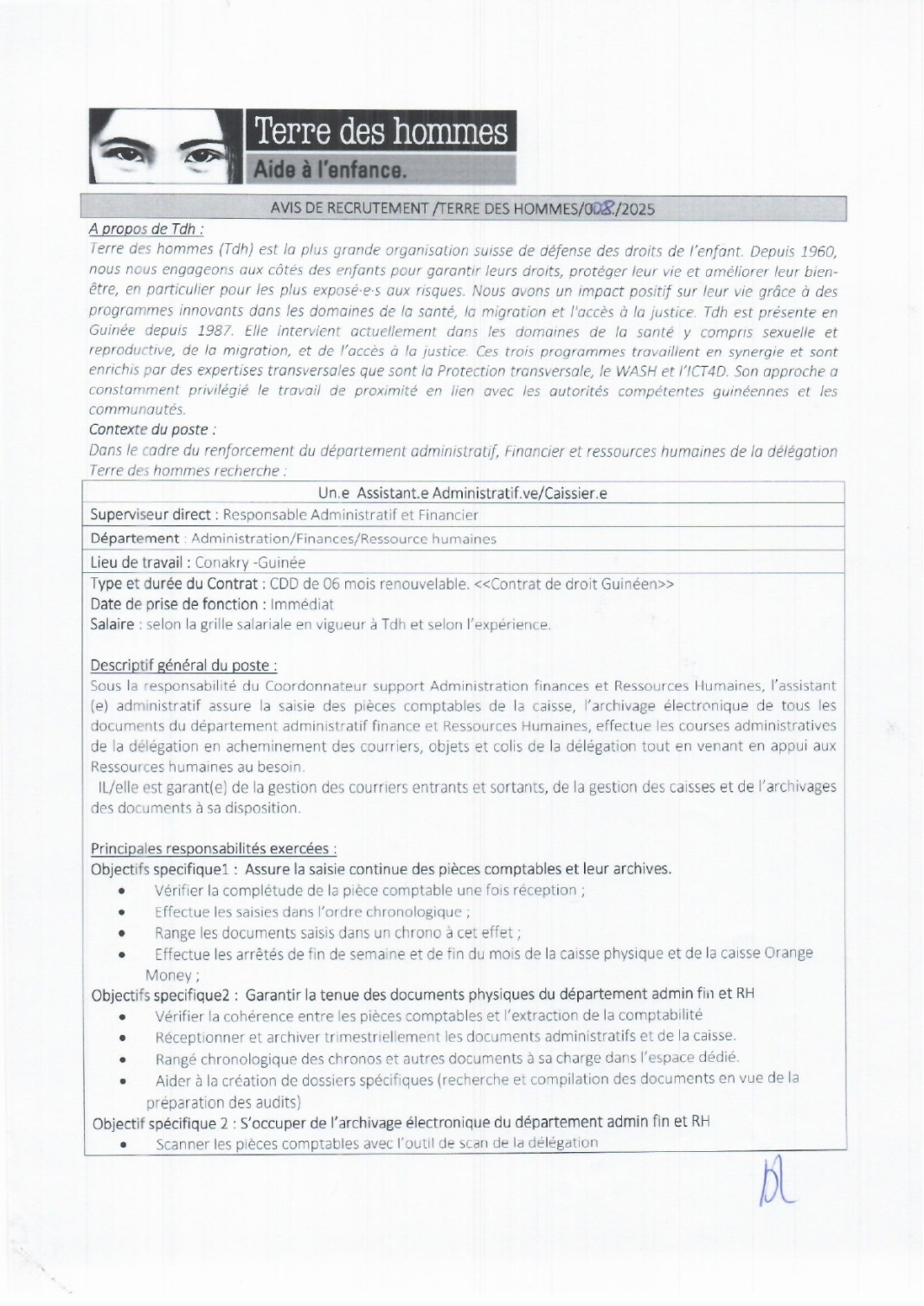 • Offre d’emploi : Terre des hommes recrute un.e Assistant.e Administratif.ve/Caissier.e
